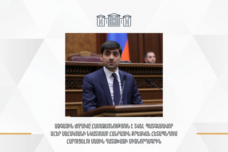 Թագուհի Թովմասյանը հանդիպել է Երեւանի պետական համալսարանի միջազգային հարաբերությունների ֆակուլտետի ուսանողների հետ Մարդու իրավունքների պաշտպանության եւ հանրային հարցերի մշտական հանձնաժողովի նախագահ Թագուհի Թովմասյանն ապրիլի 12-ին հյուրընկալել է խորհրդարանում փորձաշրջան անցնող Երեւանի պետական համալսարանի միջազգային հարաբերությունների ֆակուլտետի քաղաքագիտության եւ միջազգային հարաբերությունների բաժինների ուսանողներ... Սիսակ Գաբրիելյանը ՀՀ վարչապետից հետաքրքրվել է հայ-ռուսական հարաբերությունների ներկա մակարդակով «Քաղաքացիական պայմանագիր» խմբակցության պատգամավոր Սիսակ Գաբրիելյանն Ազգային ժողով-Կառավարություն հարցուպատասխանի ընթացքում, անդրադառնալով հայ-ռուսական հարաբերություններին, նշել է, որ հանրության մի մասը մեղադրում է իշխանությանը դրանց վատթարացման համար: Նա հետաքրքրվել է` արդյո՞ք դա ճիշտ է: «Հայ-ռուսակ... ՀՀ-Ադրբեջան հանդիպումների ձեւաչափը կվերագործարկվի. Արարատ Միրզոյանը մանրամասներ է պատմել «Քաղաքացիական պայմանագիր» խմբակցության պատգամավոր Տաթեւիկ Գասպարյանն ԱԺ-Կառավարություն հարցուպատասխանի ընթացքում ԱԳ նախարար Արարատ Միրզոյանից հետաքրքրվել է ԵՄ գործող նախագահի հետ հանդիպման ժամանակ Իլհամ Ալիեւի արած հայտարարություններով, ԼՂ հայության ինտեգրումով ու ՀՀ-Ադբեջան խաղաղության պայմանագրով:... Հասմիկ Հակոբյանի հարցը վարչապետին վերաբերել է Ադրբեջանի կողմից իրականացվող ապատեղեկատվական քարոզչությանը Երեկ մենք տեսանք, թե ինչպես միջադեպից անմիջապես հետո ադրբեջանական կողմը ստահոդ տեղեկություններ տարածեց այն մասին, որ հայկական կողմն օգտագործել է իրանական անօդաչու թռչող սարքեր, ինչը մեր ՊՆ կողմից անմիջապես հերքվեց: Չեք կարծո՞ւմ, որ նման տեղեկություններ տարածելով` Ադրբեջանը փորձում է տարածաշրջանում լ... Մենք ընդդիմադիր եղել ենք, բայց «5-րդ շարասյուն» չենք եղել. ՀՀ վարչապետը պատասխանել է Վահագն Ալեքսանյանի հարցին ՀՀ երրորդ նախագահ Սերժ Սարգսյանը, խոսելով իրեն հաջորդած իշխանությանը ժառանգություն թողած տարատեսակ զինատեսակների տիրապետող բանակի մասին, նշել է, որ իբր 44-օրյա պատերազմի ժամանակ դրանք չեն օգտագործվել. ՀՀ ԱԺ «Քաղաքացիական պայմանագիր» խմբակցության պատգամավոր Վահագն Ալեքսանյանն ԱԺ-Կառավարություն հարցու... Քանի դեռ տղաները չեն վերադարձել, կարող ենք ասել՝ մեր աշխատանքում չենք հաջողել. ՀՀ վարչապետ Գերիների հարազատները փակել են Գյումրի-Բավրա միջպետական ճանապարհը. ԱԺ-Կառավարություն հարցուպատասխանի ժամանակ պատգամավոր Էմմա Պալյանը դիմել է Նիկոլ Փաշինյանին ու նշել, որ ծնողներն անհամբեր են եւ սպասում են հենց վարչապետի խոսքին: Ի պատասխան՝ գործադիրի ղեկավարը փաստել է, որ խնդիրը պետական մա... Ադրբեջանի պահվածքն ու գործունեությունը եղել են ուխտադրուժ. Նիկոլ Փաշինյան ԱԺ «Քաղաքացիական պայմանագիր» խմբակցության պատգամավոր Արմեն Խաչատրյանը վարչապետից հետաքրքրվել է Տեղ գյուղի մոտակայքում երեկ՝ ապրիլի 11-ին, տեղի ունեցած զինված բախումով՝ սկսած դեռեւս մարտի 29-ից, երբ ադրբեջանական զորքերի շարժ է նկատվել: «Ի՞նչ գնահատական կտայիք մեր ուժային մարմինների գործունեությանը»,-... Ադրբեջանի ԶՈՒ սադրանքի պահին ԵՄ դիտորդական առաքելությունը ներկա չի եղել Տեղ համայնքում. Արարատ Միրզոյան Ադրբեջանի ԶՈՒ երեկվա սադրիչ գործողությունները ԵՄ քաղաքացիական մոնիտորինգային տեսադաշտի ներքո՞ են եղել, նրանք տեխնիկապես այդ սադրանքներն արձանագրելու հնարավորություն ունեցե՞լ են: Այս մասին ԱԺ-Կառավարություն հարցուպատասխանի ժամանակ հետաքրքրվել է «Քաղաքացիական պայմանագիր» խմբակցության պատգամավոր Էդուար... Արդյո՞ք հնարավոր էր կանխել Տ